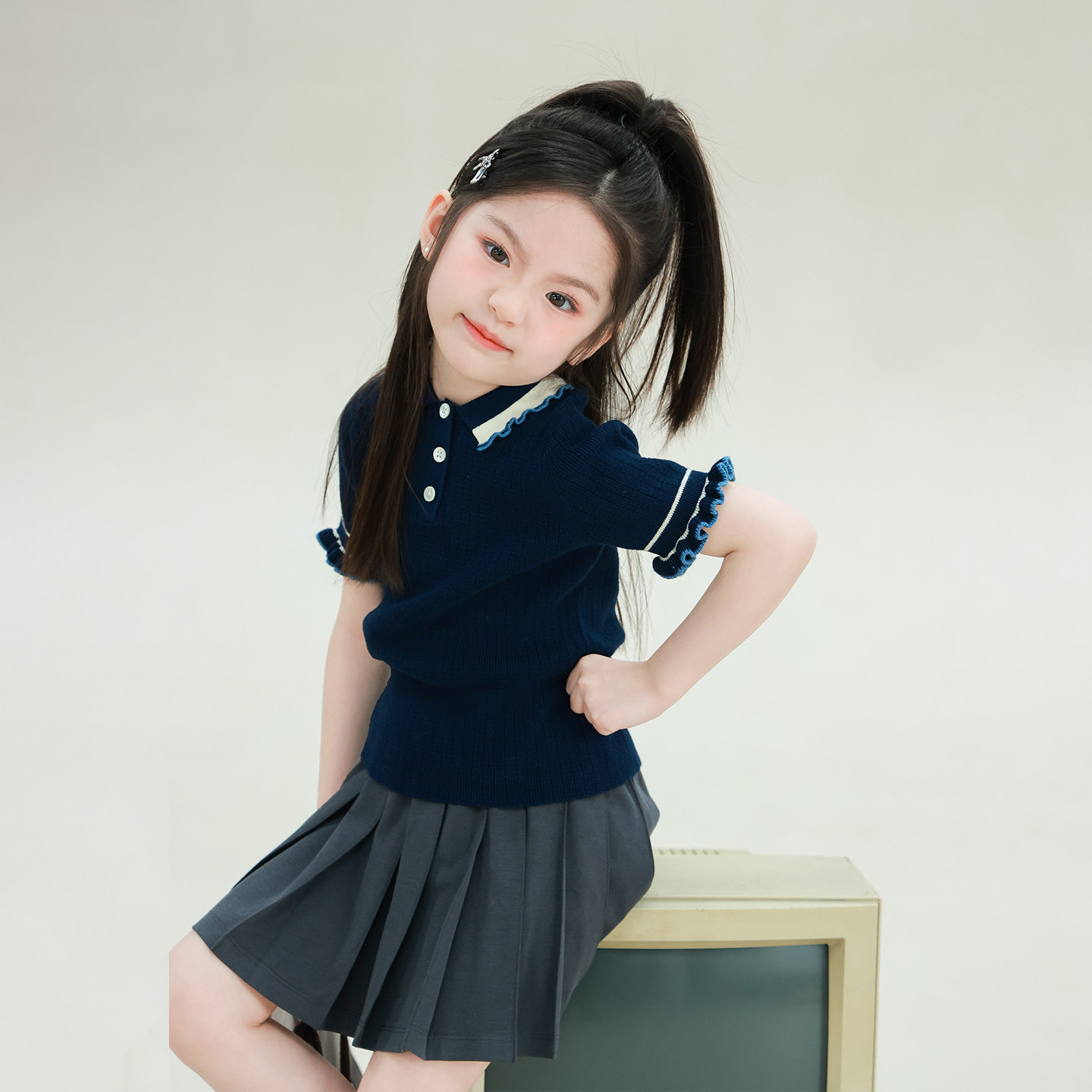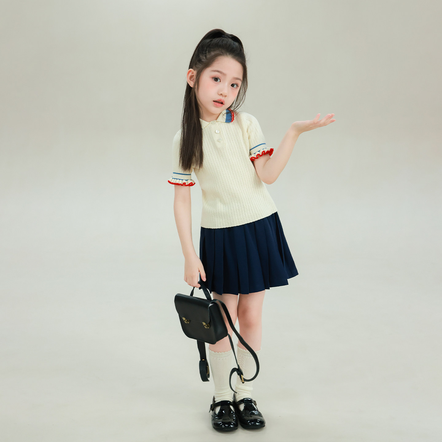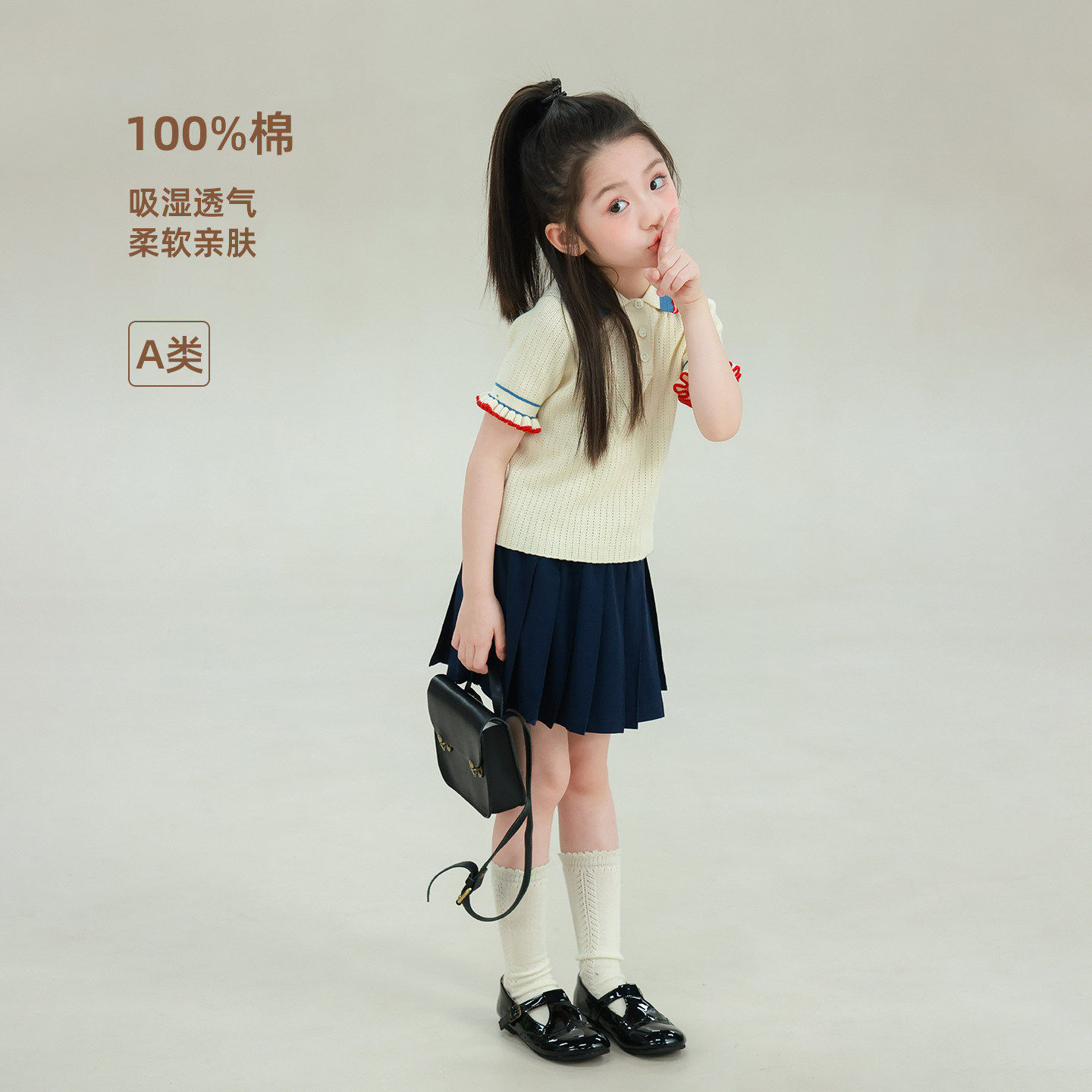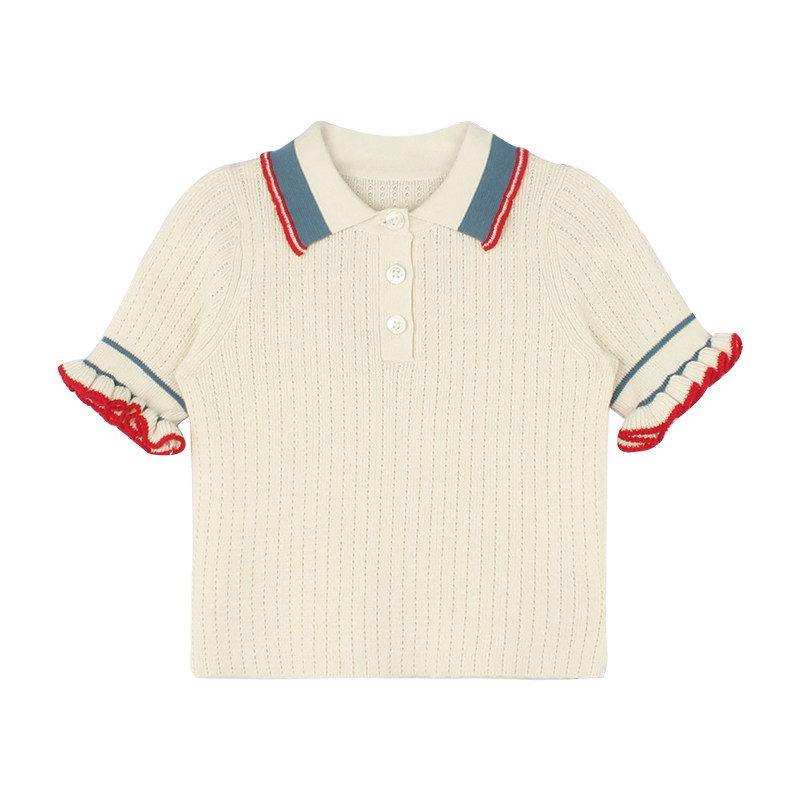 大耳象女童花边袖针织短袖2026夏季新款宝儿纯棉翻领英伦风薄上衣