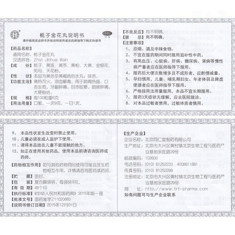 同仁堂栀子金花丸10袋肺胃热盛口舌生疮牙龈肿痛目赤眩晕咽喉肿痛