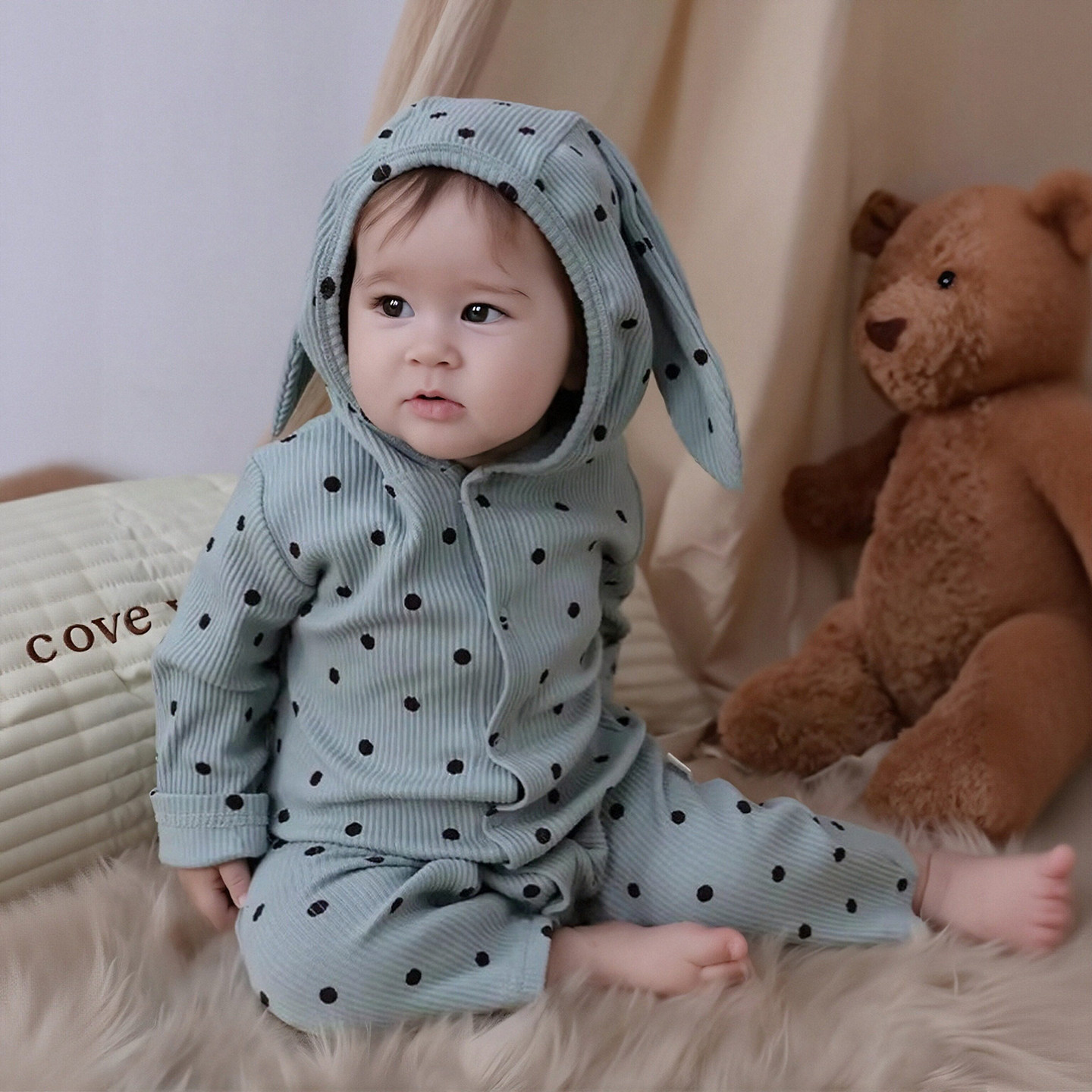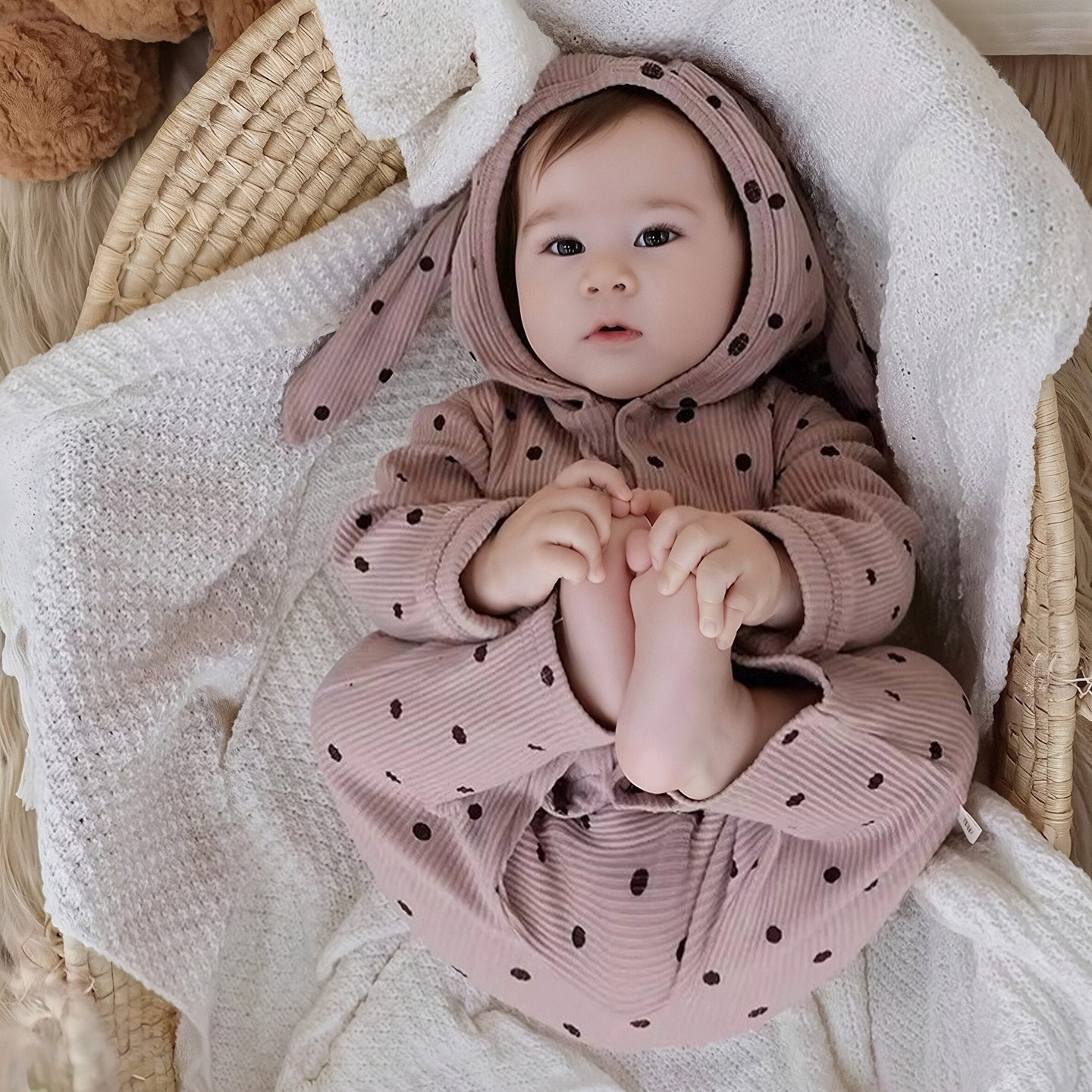 婴儿兔耳朵连帽连体衣春秋季ins风婴幼儿纯棉a类哈衣新生儿家居服