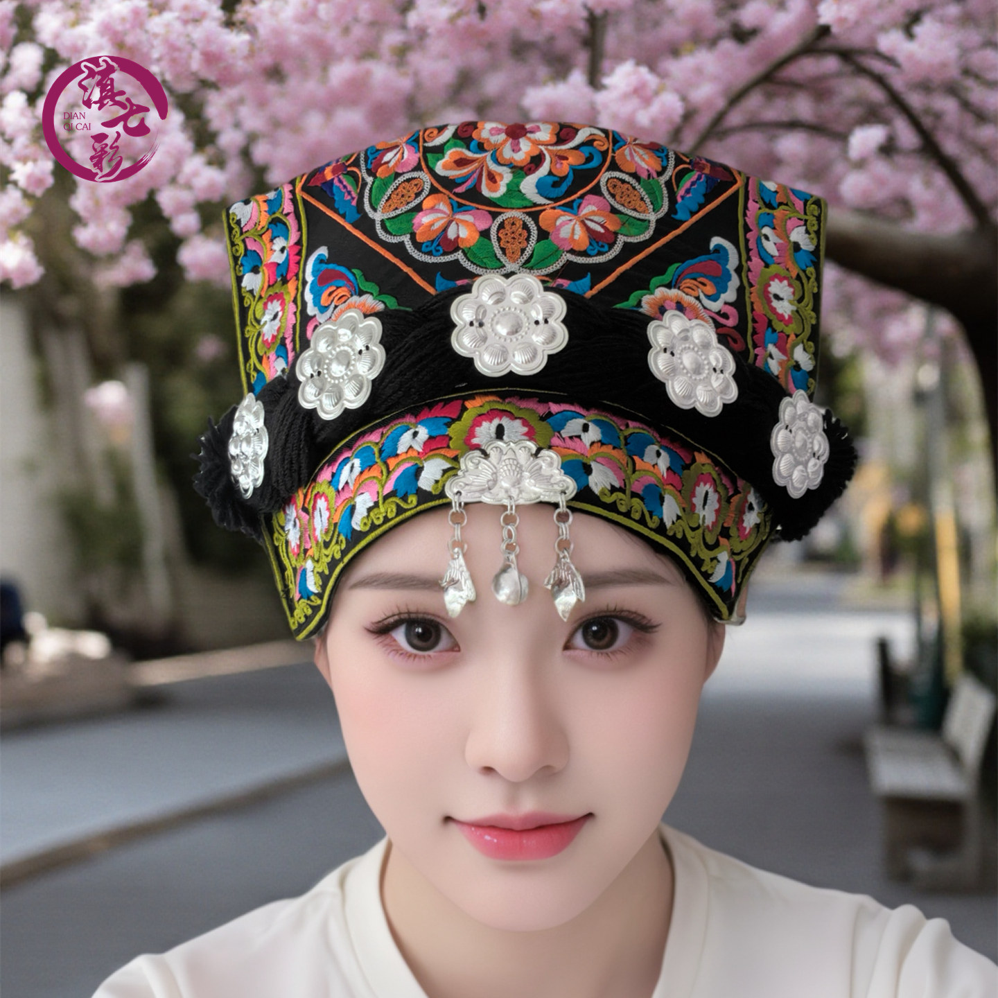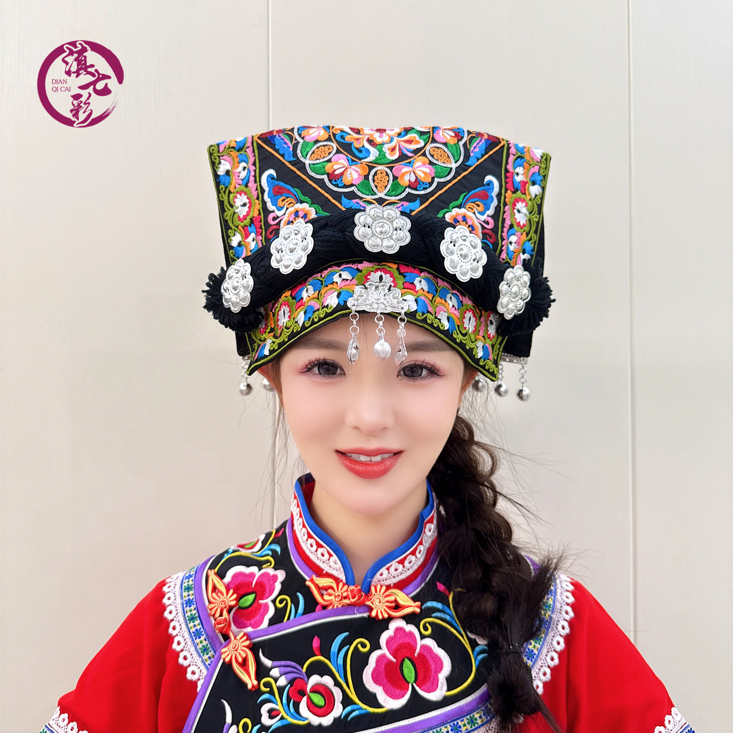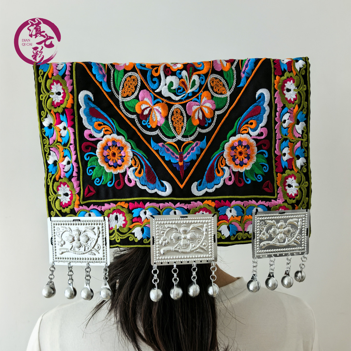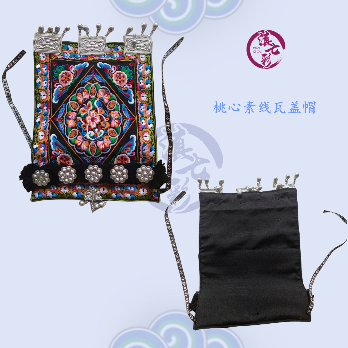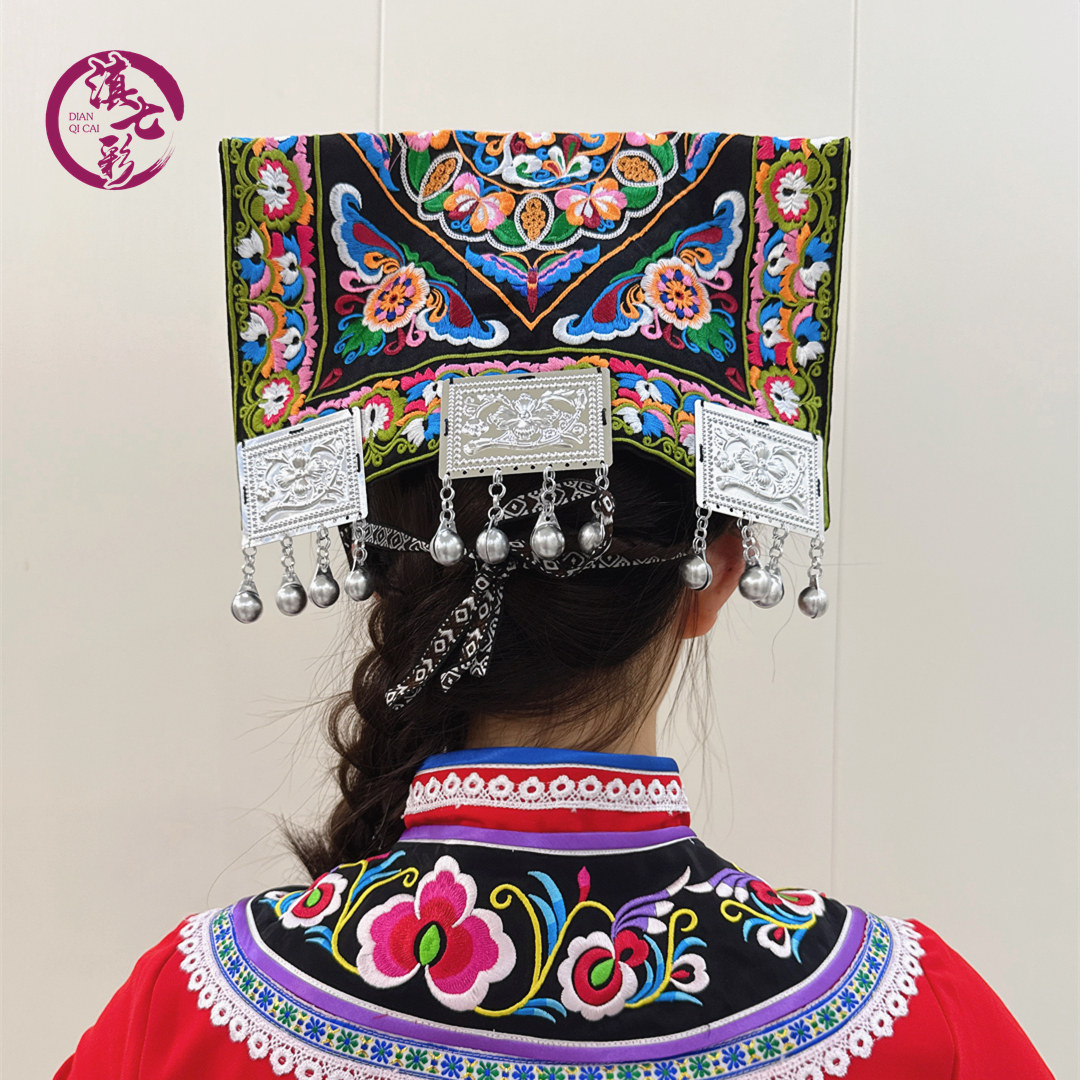 云南贵州布依族瓦盖帽桃心素线绣花铃铛佤盖帽少数民族服装配饰