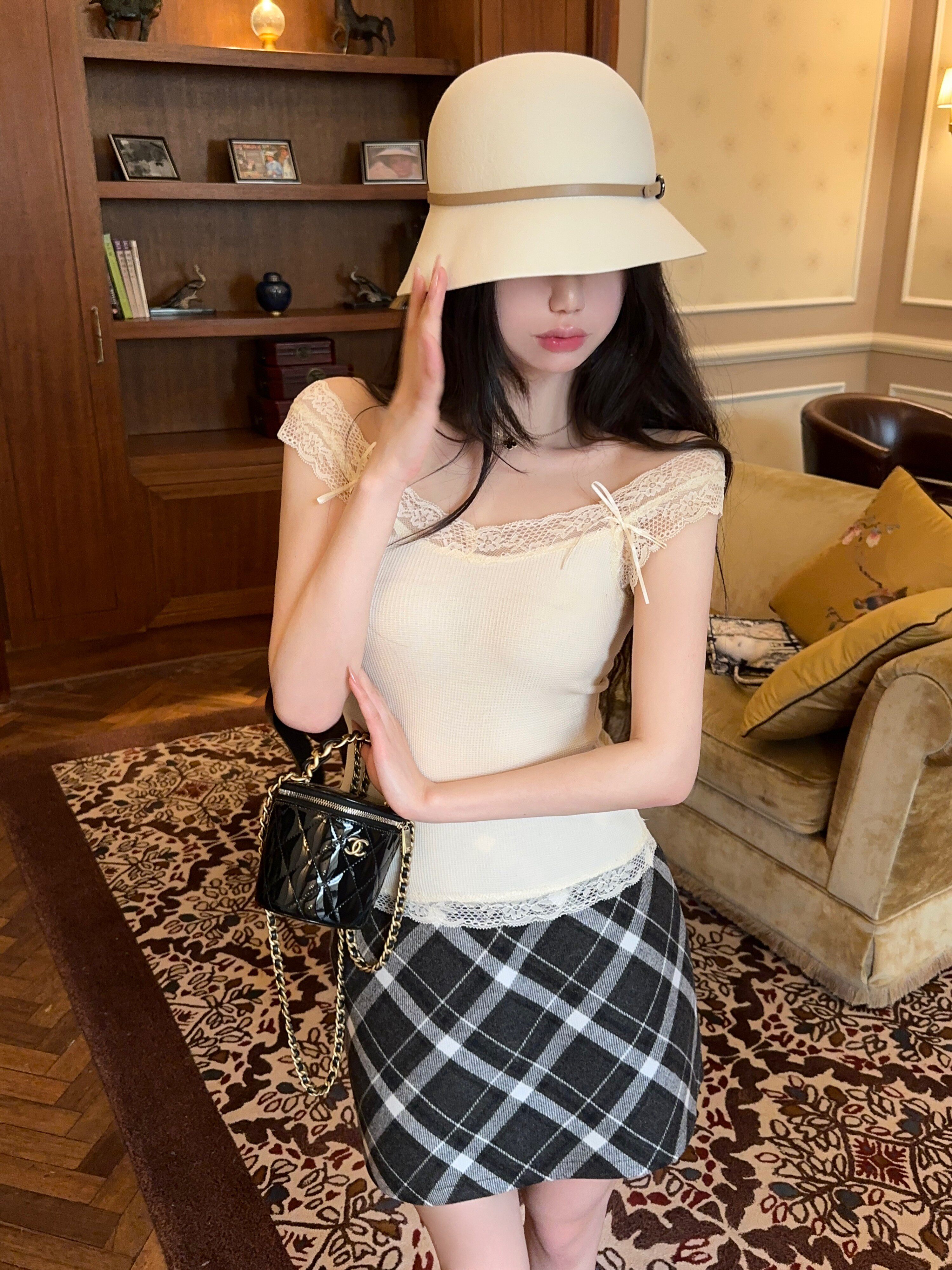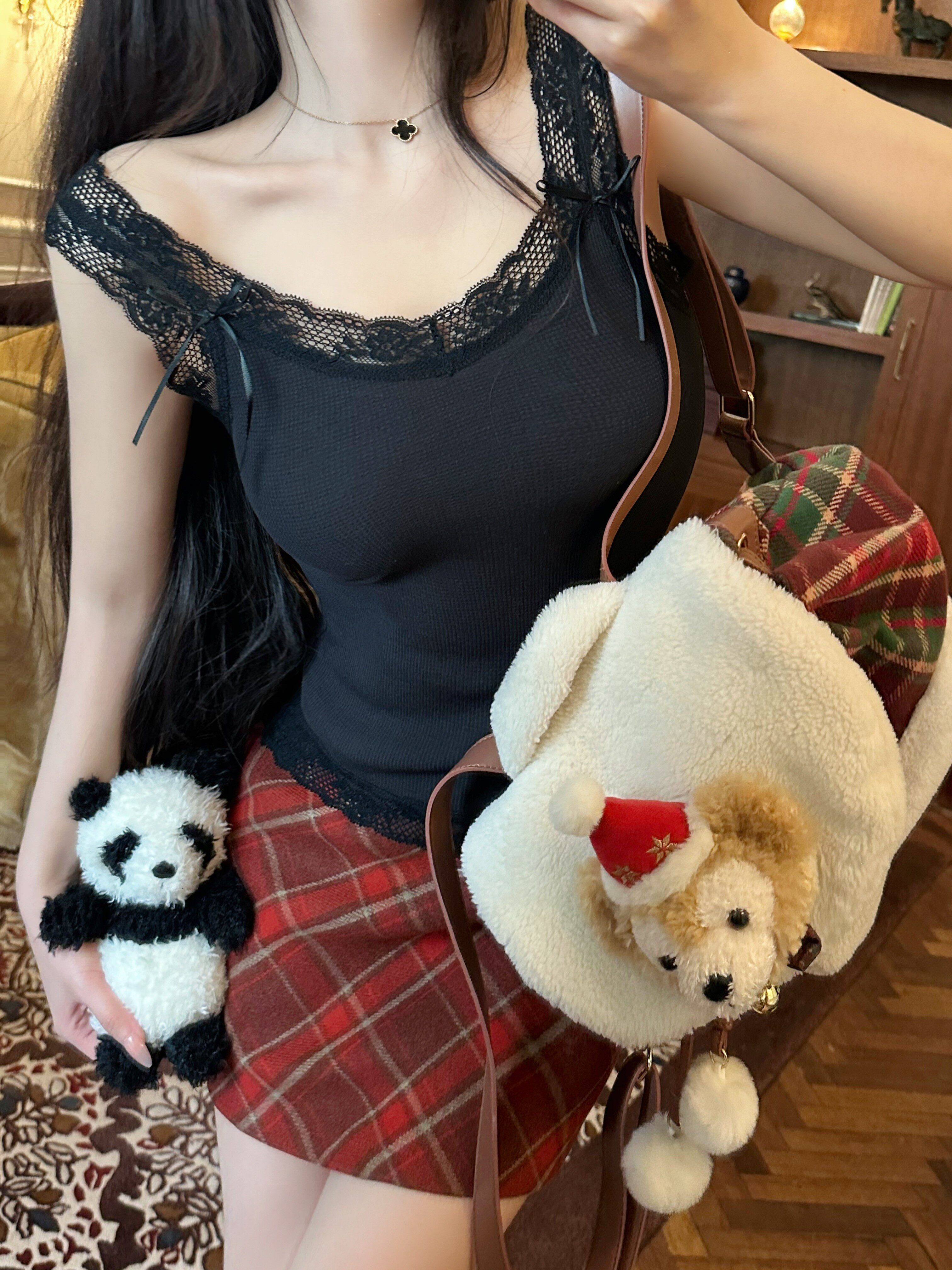 JAMAIS VU【茶艺喃喃】清纯双生蕾丝奶酪格 软糯吊带背心夏季新款