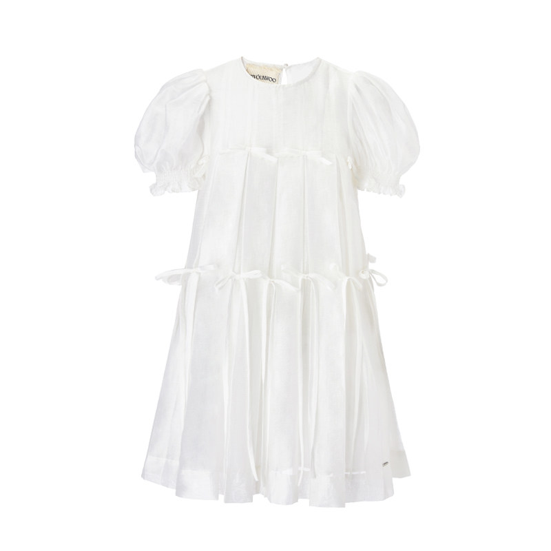 HSIYOUNWOO夏天丝麻高级少女设计感小众泡泡袖娃娃仙女A字连衣裙