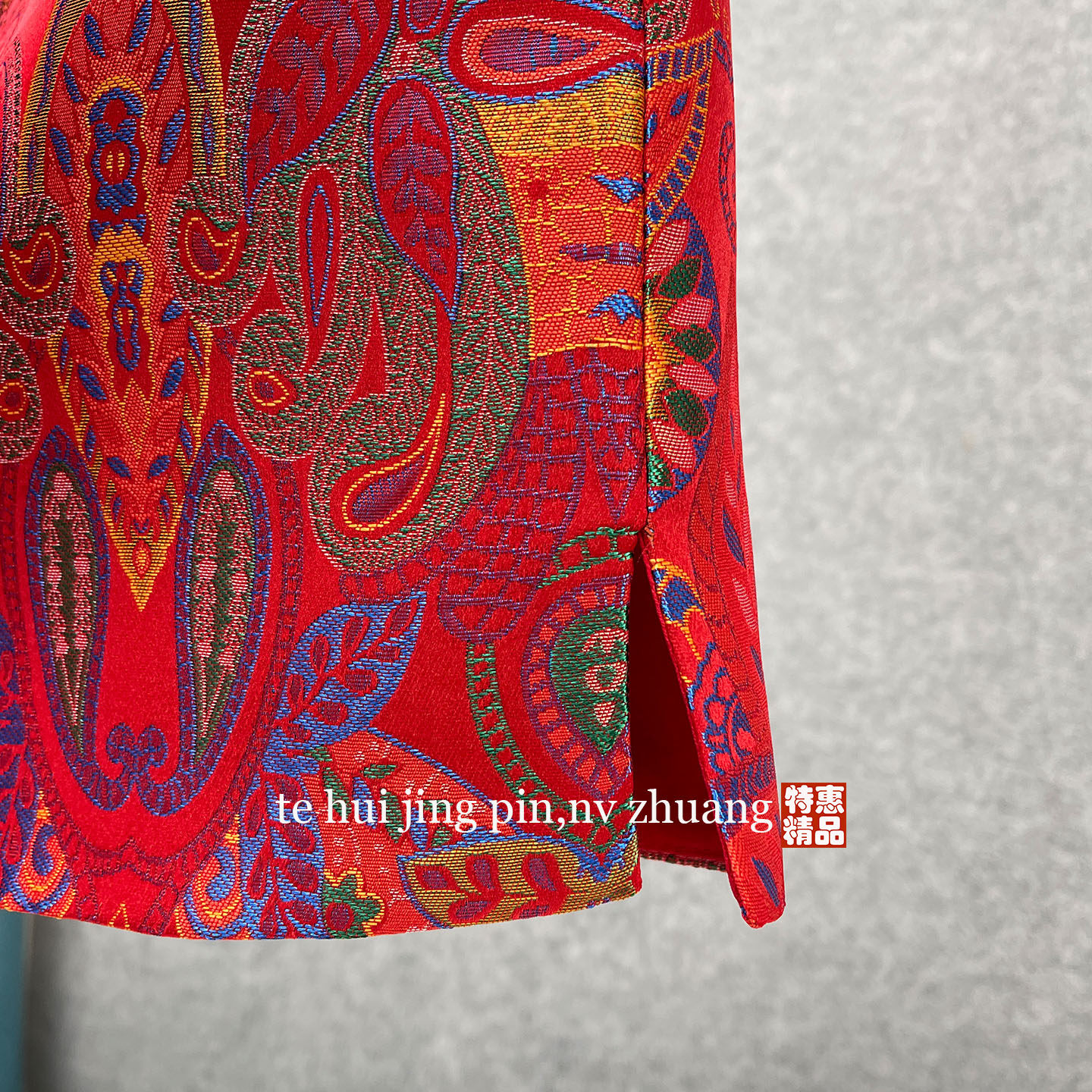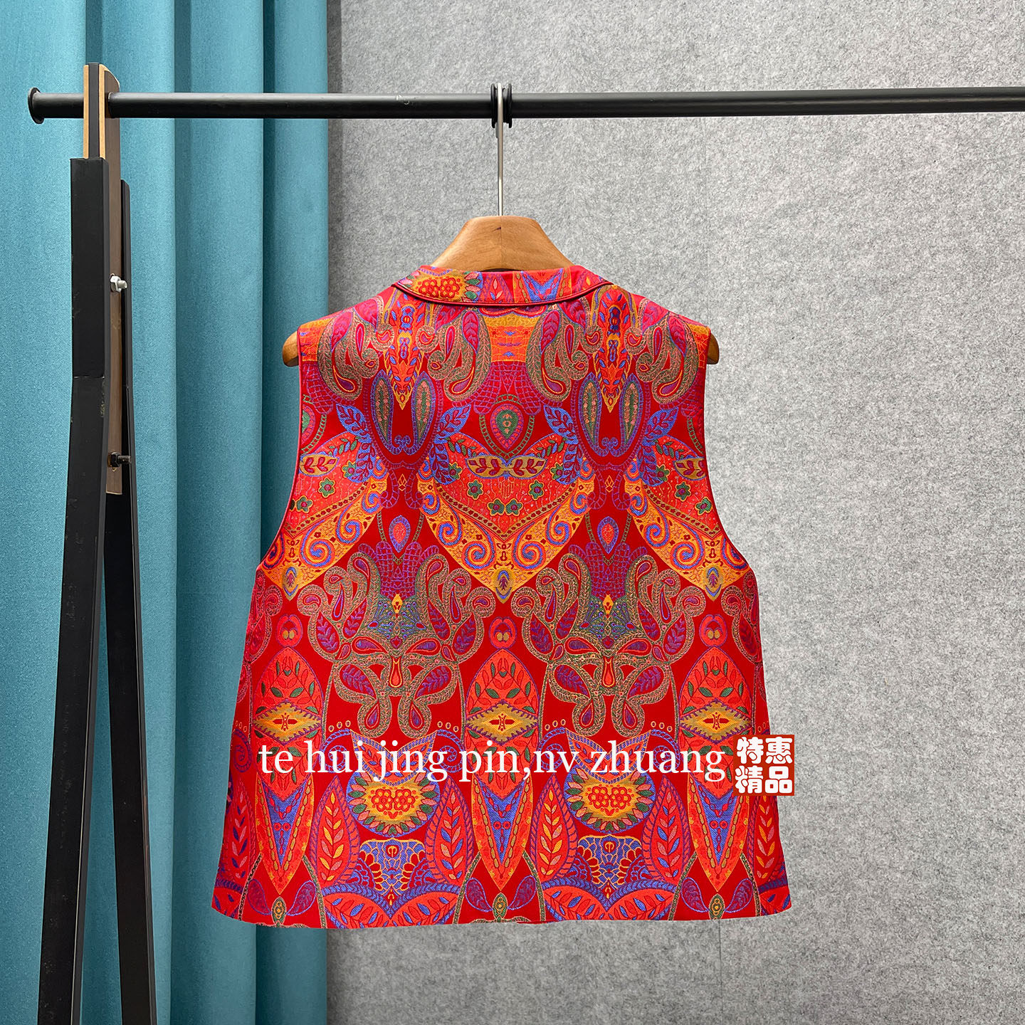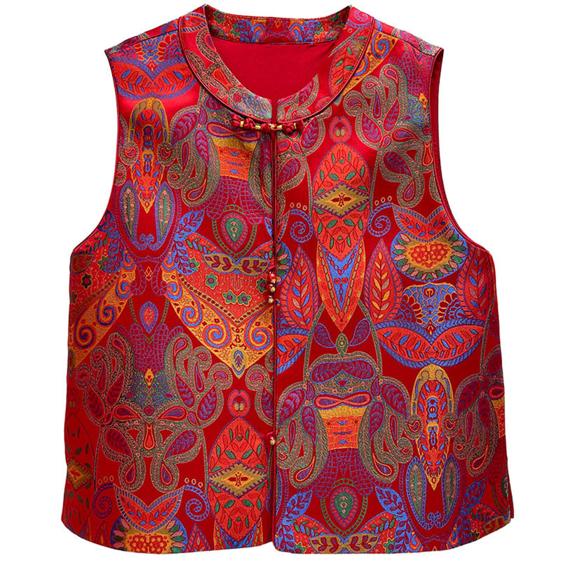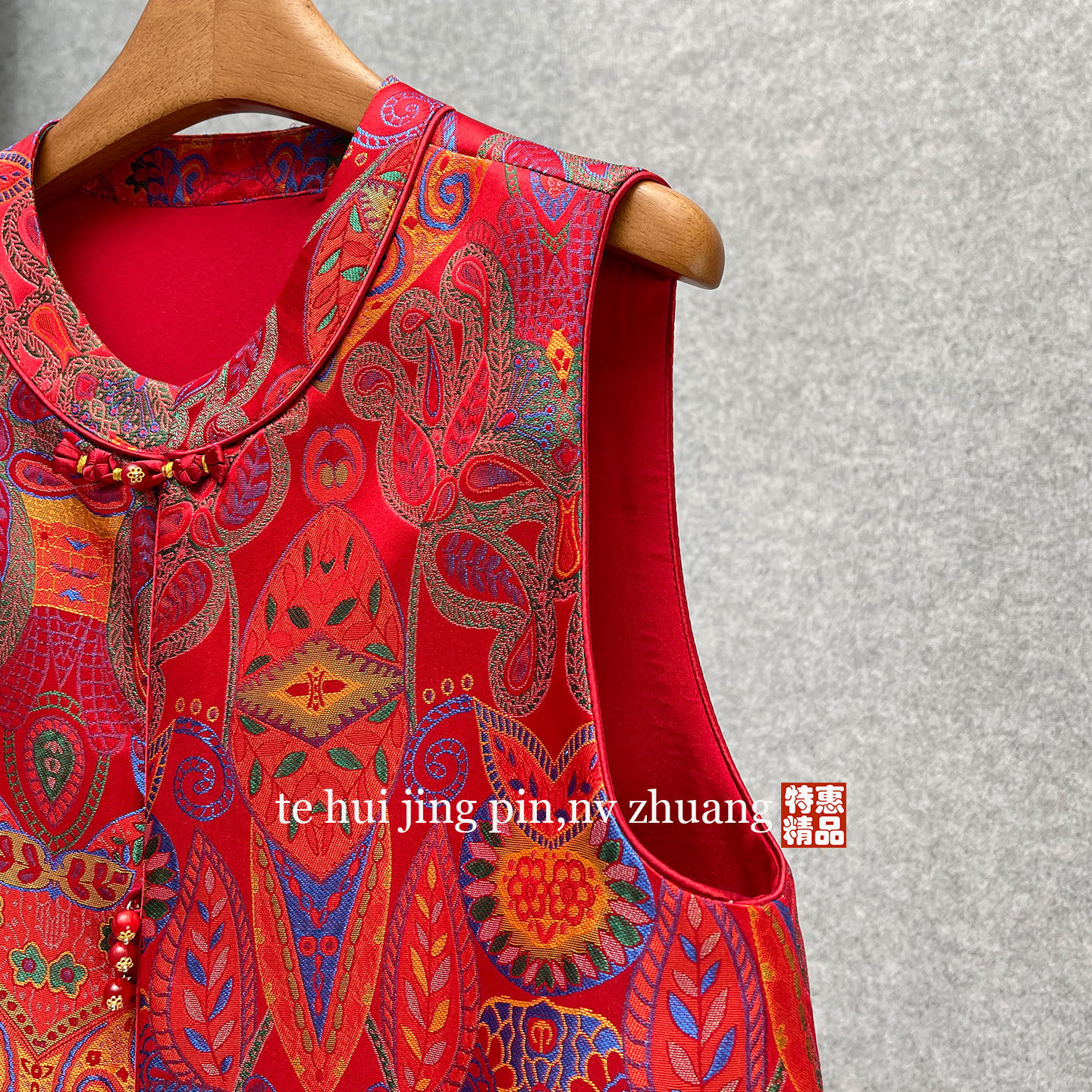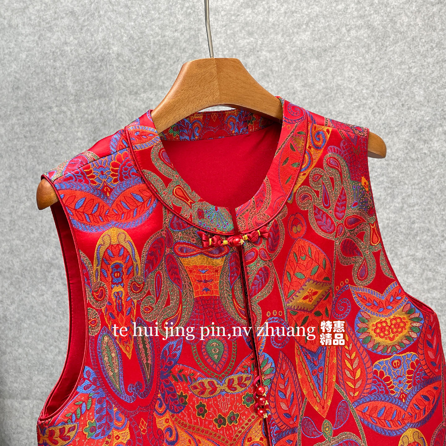 新中式红色彩绘马甲女圆领单排扣人造丝富贵吉祥短款中年女士马甲