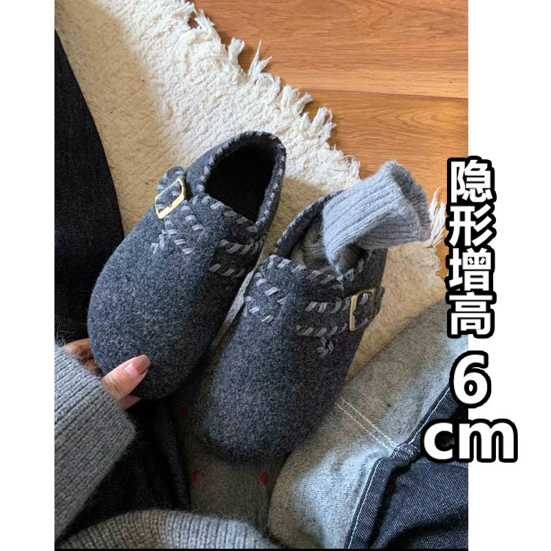 增高6cm~格雷风灰加绒勃肯鞋女冬季加厚毛毛鞋棉鞋厚底保暖单鞋女