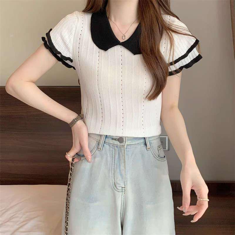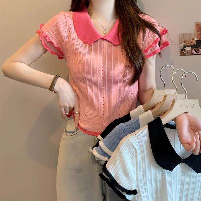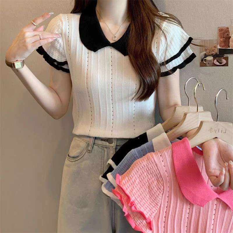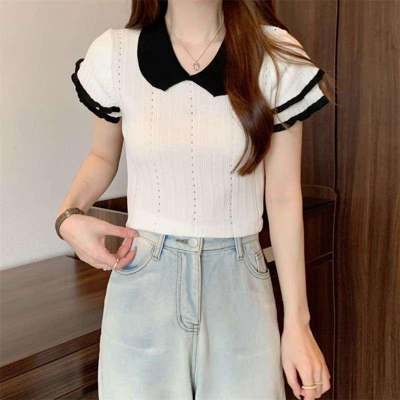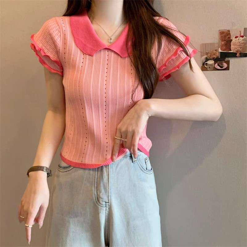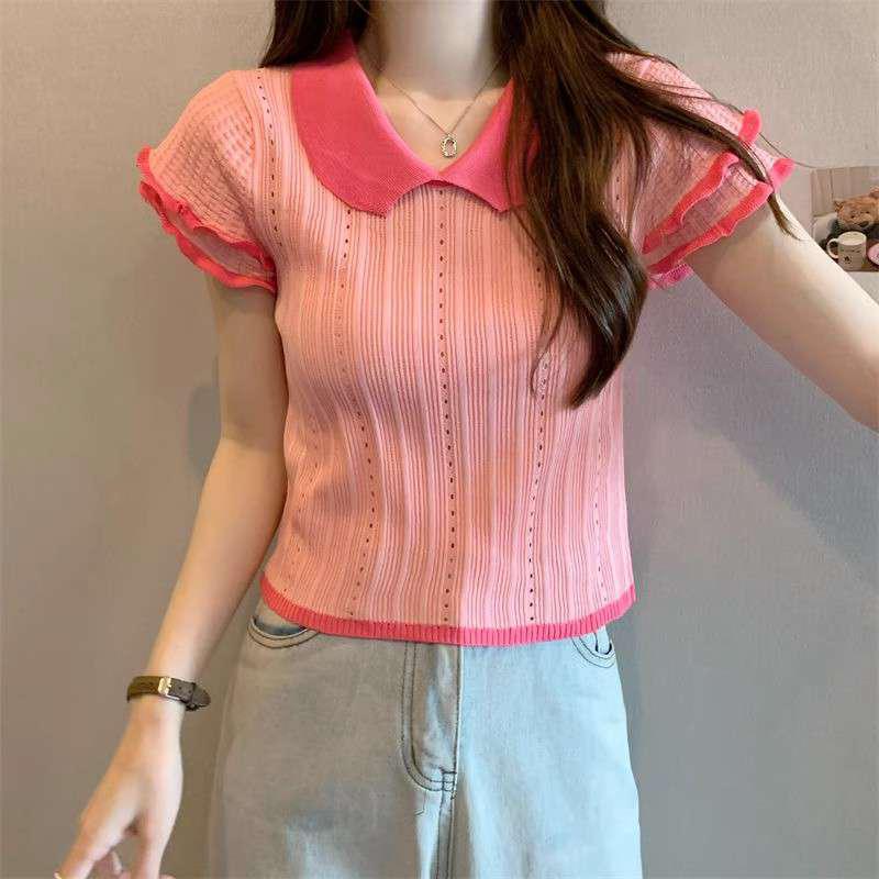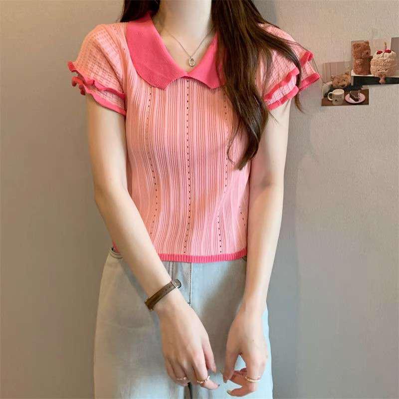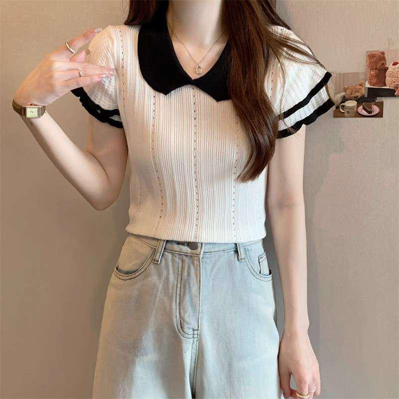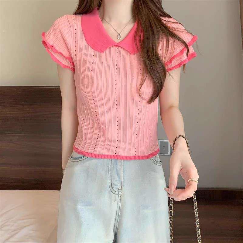 1688镂空娃娃领冰丝针织短袖T恤女夏季薄款设计感小众短款上衣潮