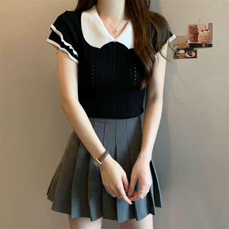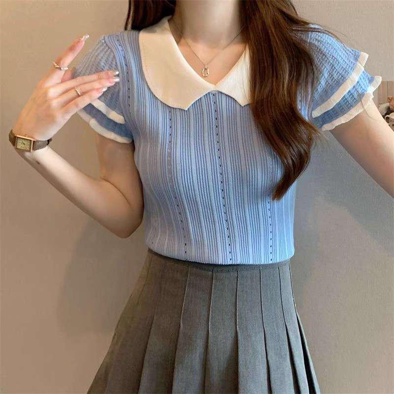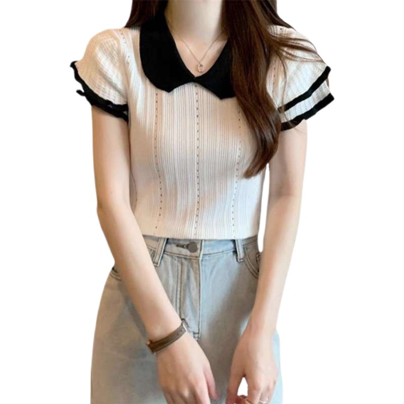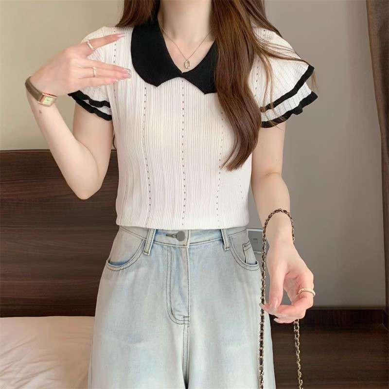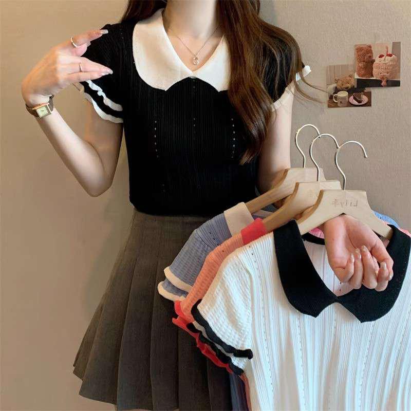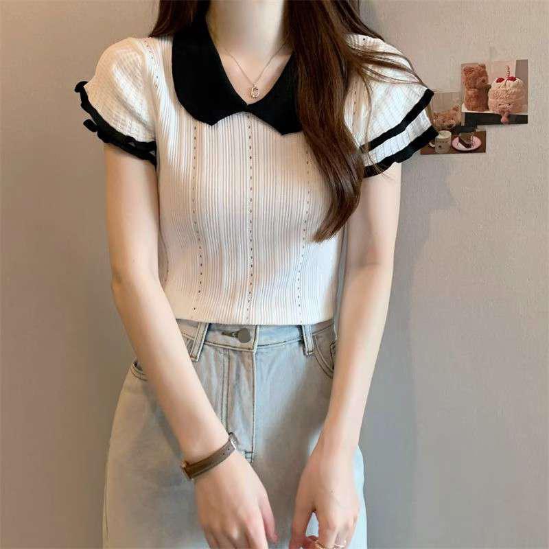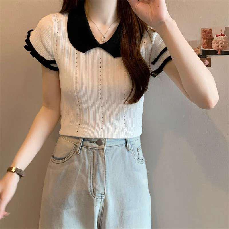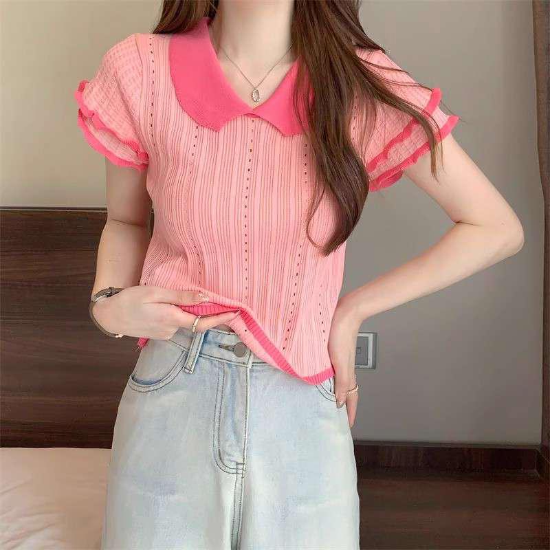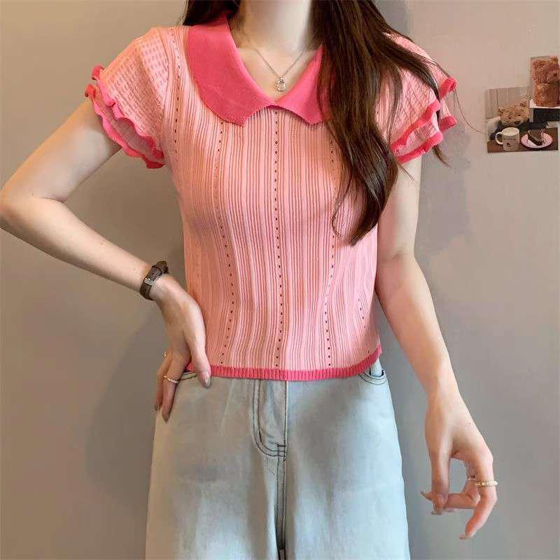 1688镂空娃娃领冰丝针织短袖T恤女夏季薄款设计感小众短款上衣潮