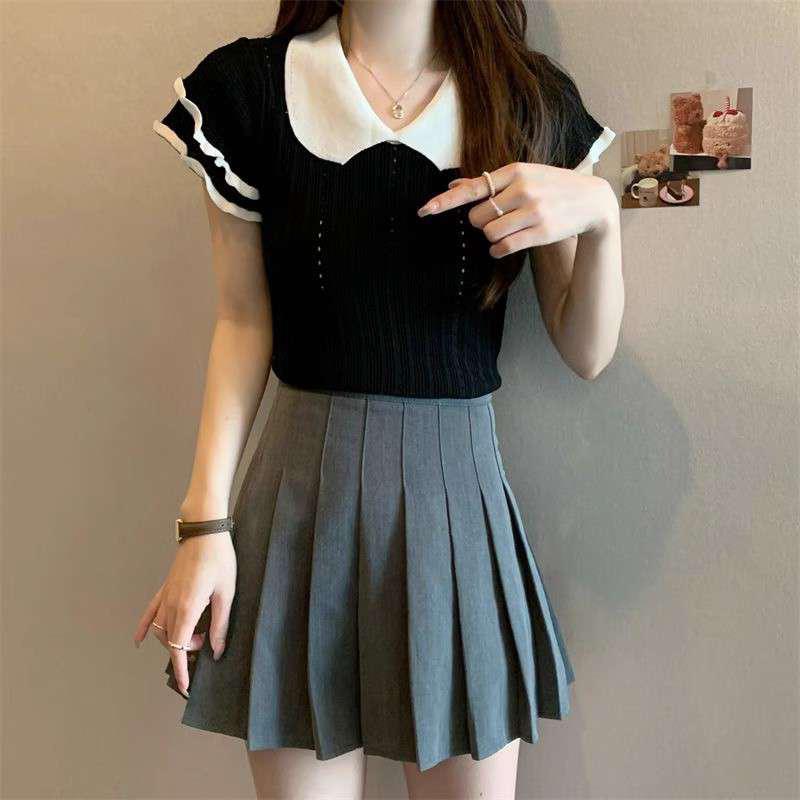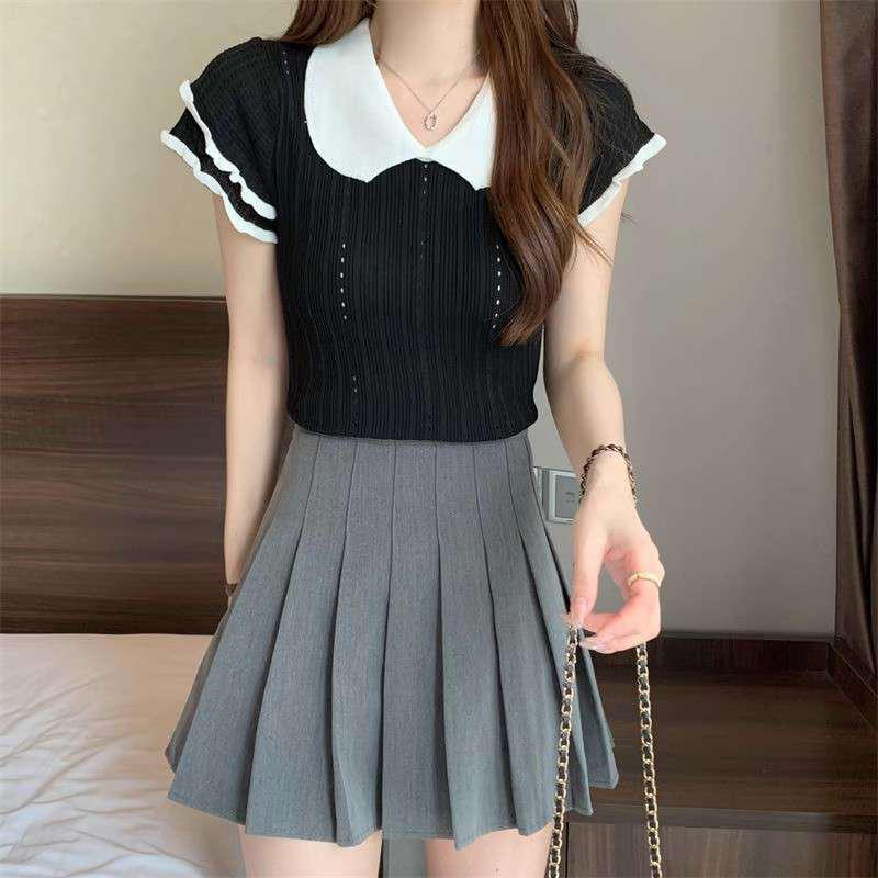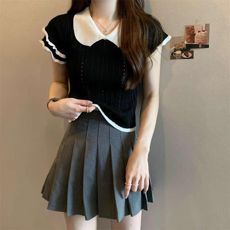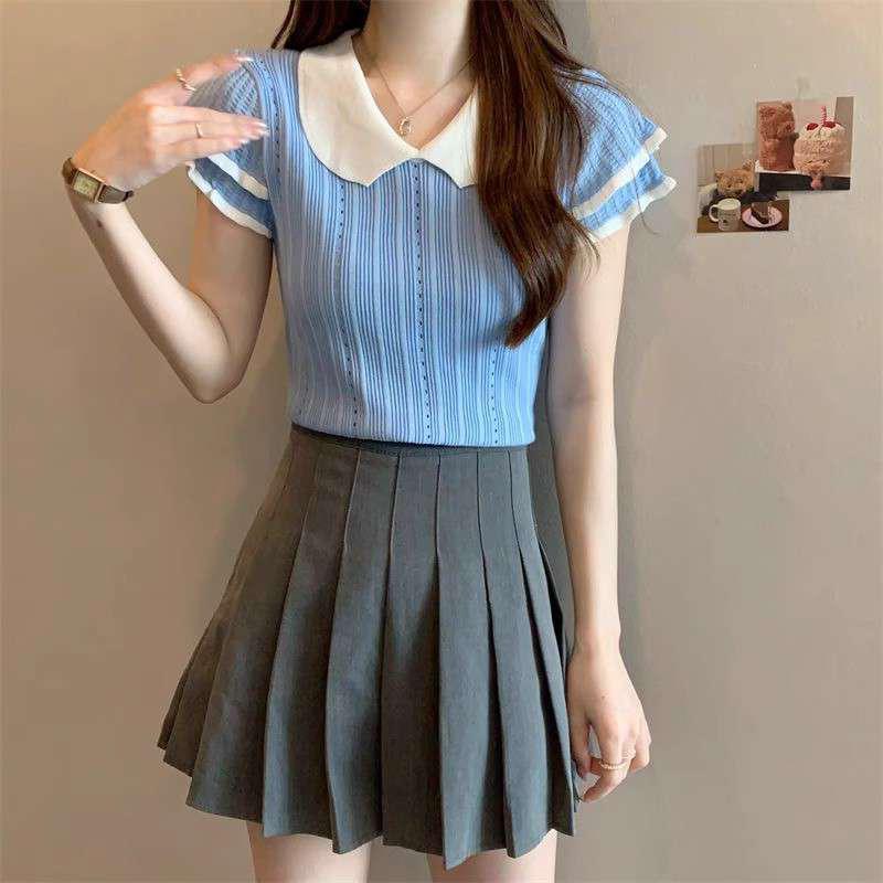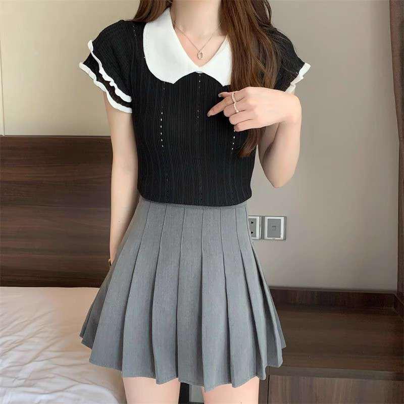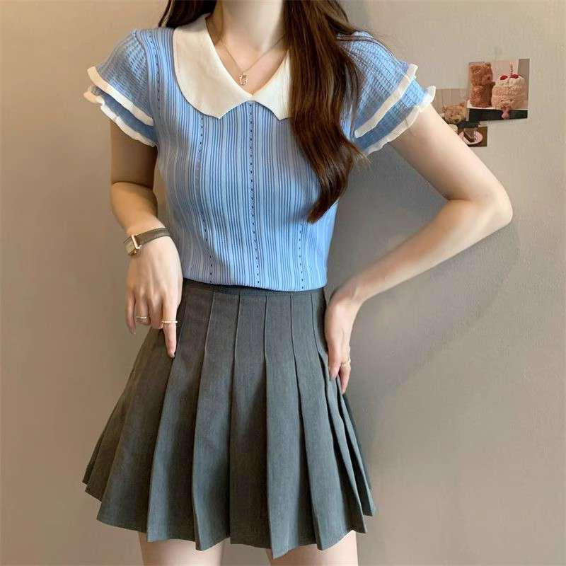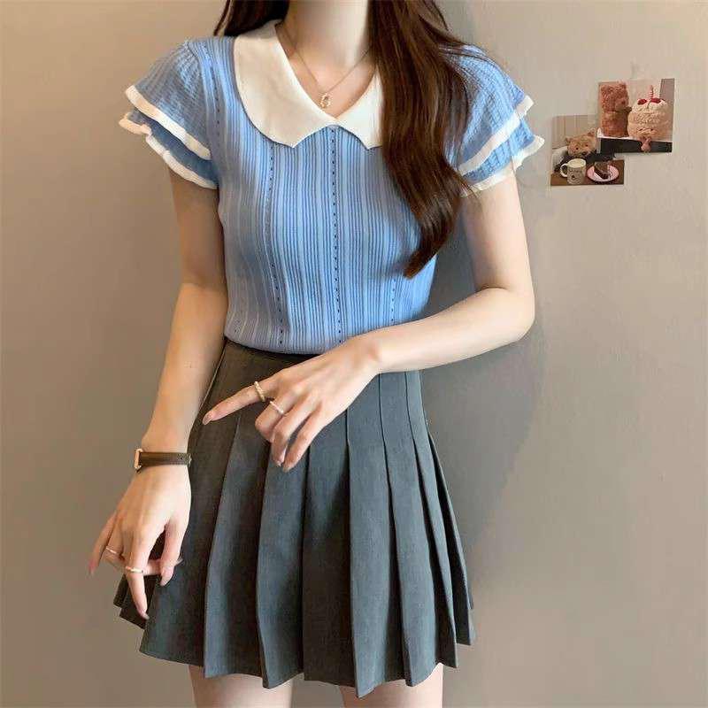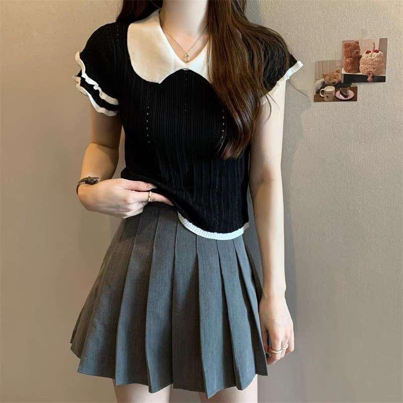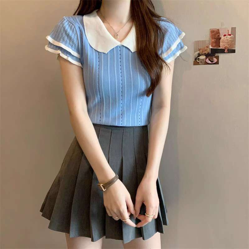 1688镂空娃娃领冰丝针织短袖T恤女夏季薄款设计感小众短款上衣潮