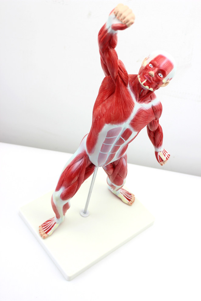 功能特点:该模型显示人体全身肌肉运动时的肌肉状态,展示了人体浅层肌肉的分布和构造,适合于美术教学,和医学讲解